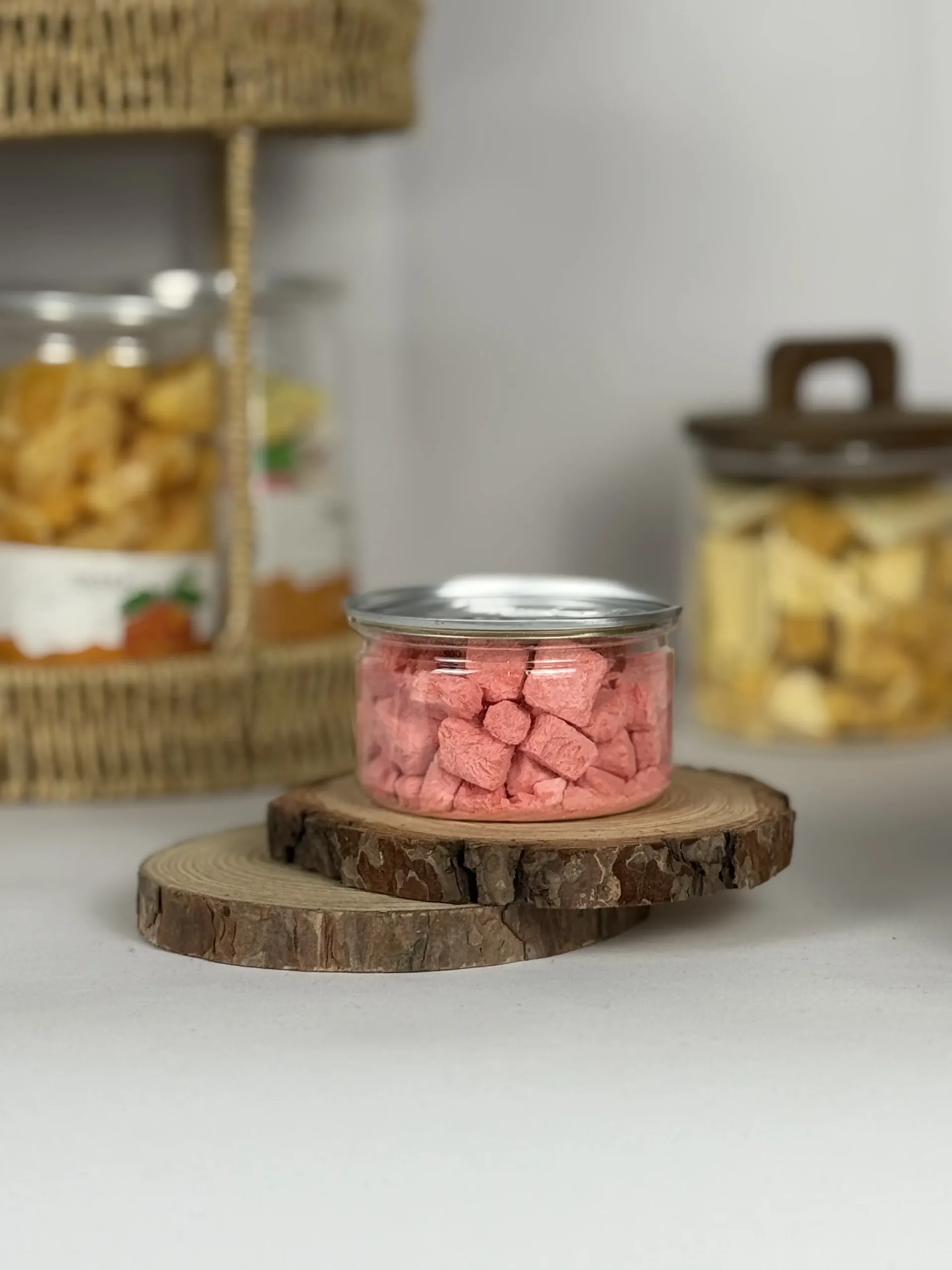 كل الفواكه مجففة بتقنية التبريد للحفاظ على اللون والطعم والقوام – سناك مقرمش في كل لقمة، بدون أي سكر مضاف أو مواد حافظة.