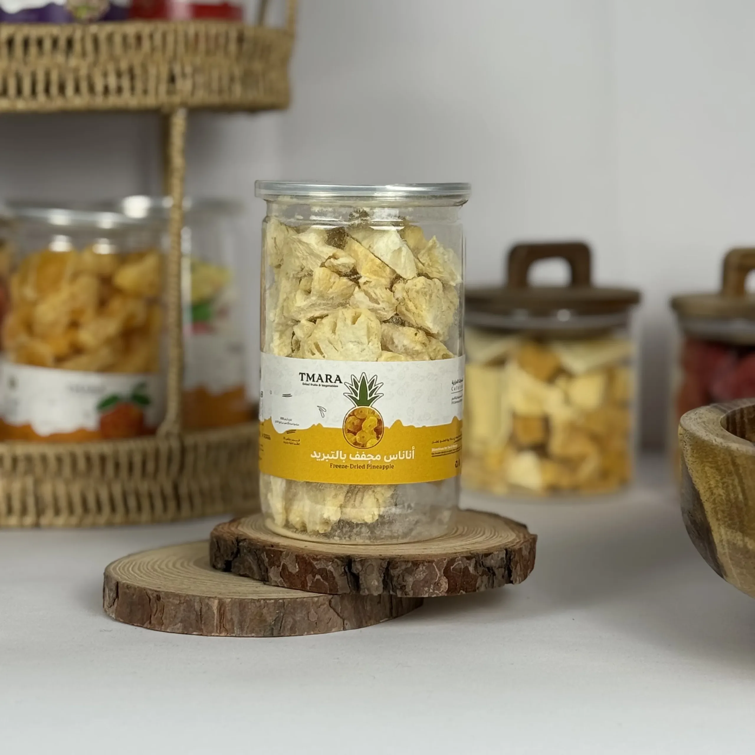 استمتع بمذاق أناناس مجفف بالتبريد المتجدد من تمارا، الخيار الأول لمحبي الطعم القوي والقوام الفريد. نختار أفضل ثمار الأناناس فارهة ونجففها تقنية التبريد المتطورة لنقدم لك قطعاً خفيفة جداً بحلاوتها الطبيعية ومزازتها الممتعة مع قرمشة تذوب في الشفاه فوراً. سواء كنت تبحث عن سناك صحي يجدد نشاطك أو إضافة مميزة لأطباقك، حيث أن هذا المنتج تجربة الفواكه المختلفة بتركيز خيالي وقوام مبتكر لا يقاوم.